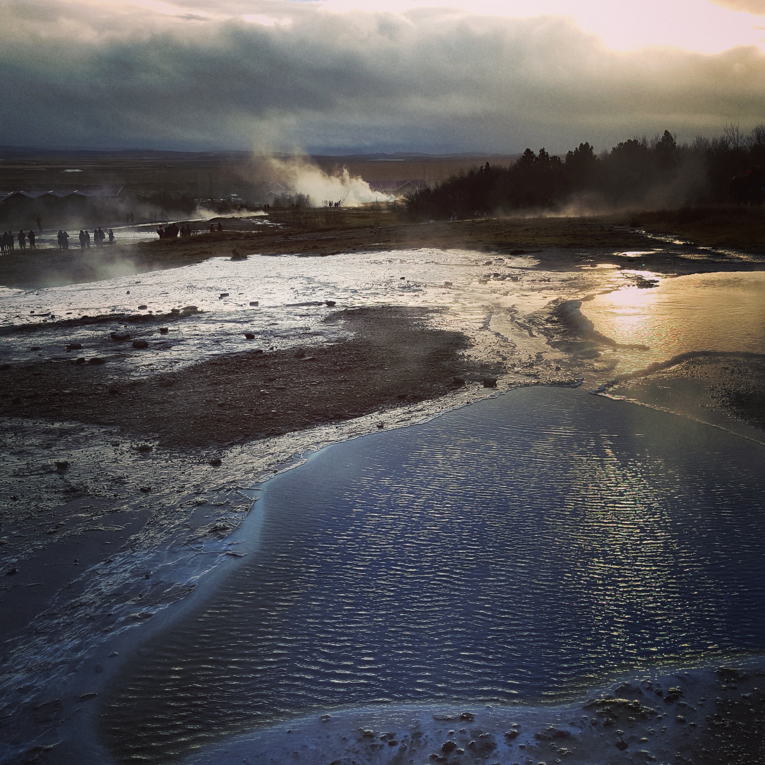 Als der Regen wieder einsetze ging es weiter zu den Geysiren. Nach kurzer Autofahrt sah man es schon qualmen und nach kurzen Kaffeestop hatten wir auch wieder gutes Wetter und die Geysire konnten bestaunt werden. Schon allein der Geruch ist sehr beeindruckend, nämlich sehr schwefelig. Sprich es duftet überall nach faulen Eiern und manchmal stapft man durch richtige Rauchwolken. Wir hatten dort echt wunderschönes Licht, weil die Sonne gerade durch die Wolken brach. Da verging das Warten auf den Ausbruch wie im Flug.