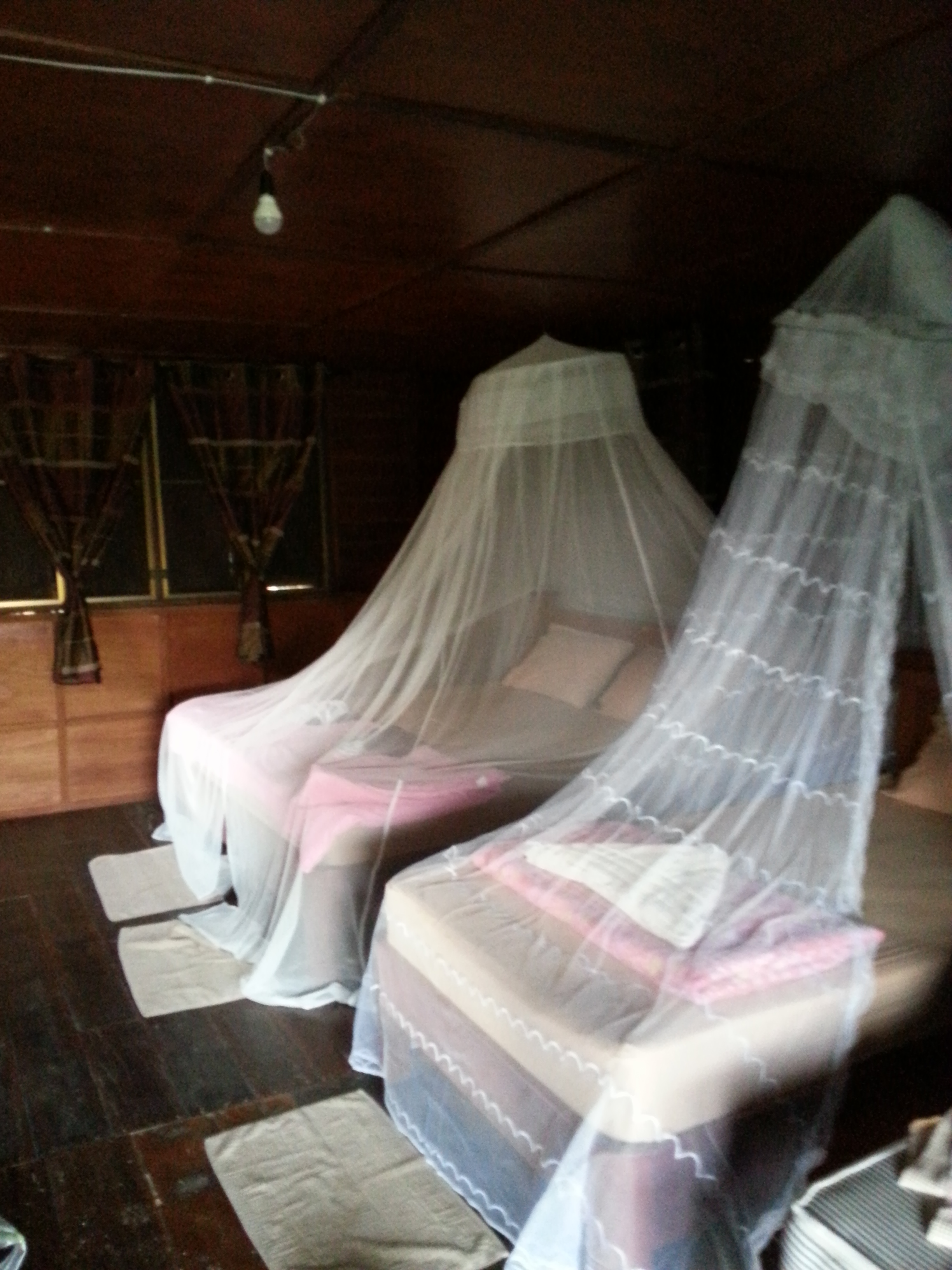 Genächtigt haben wir auch ganz wunderschön. Direkt am Fluss Kwai in einen schönen Holzbungalow ganz für uns alleine. Nachts ist es dort stockdunkel, da es nur Solarstrom gibt und dieser sparsam benutzt wird. Wir hatten einen einmaligen Sternenhimmel und dazu die ganzen Geräusche aus dem Dschungel. Wahnsinn! Damit wir uns nicht gruselten haben sich die Hunde dazu entschlossen abwechseln Wache vor unserer Tür zu schieben und auf uns aufzupassen. Die Hunde waren echt toll. Sie bewegen sich frei auf dem Gelände und man hat sie den ganzen Tag um sich herum.