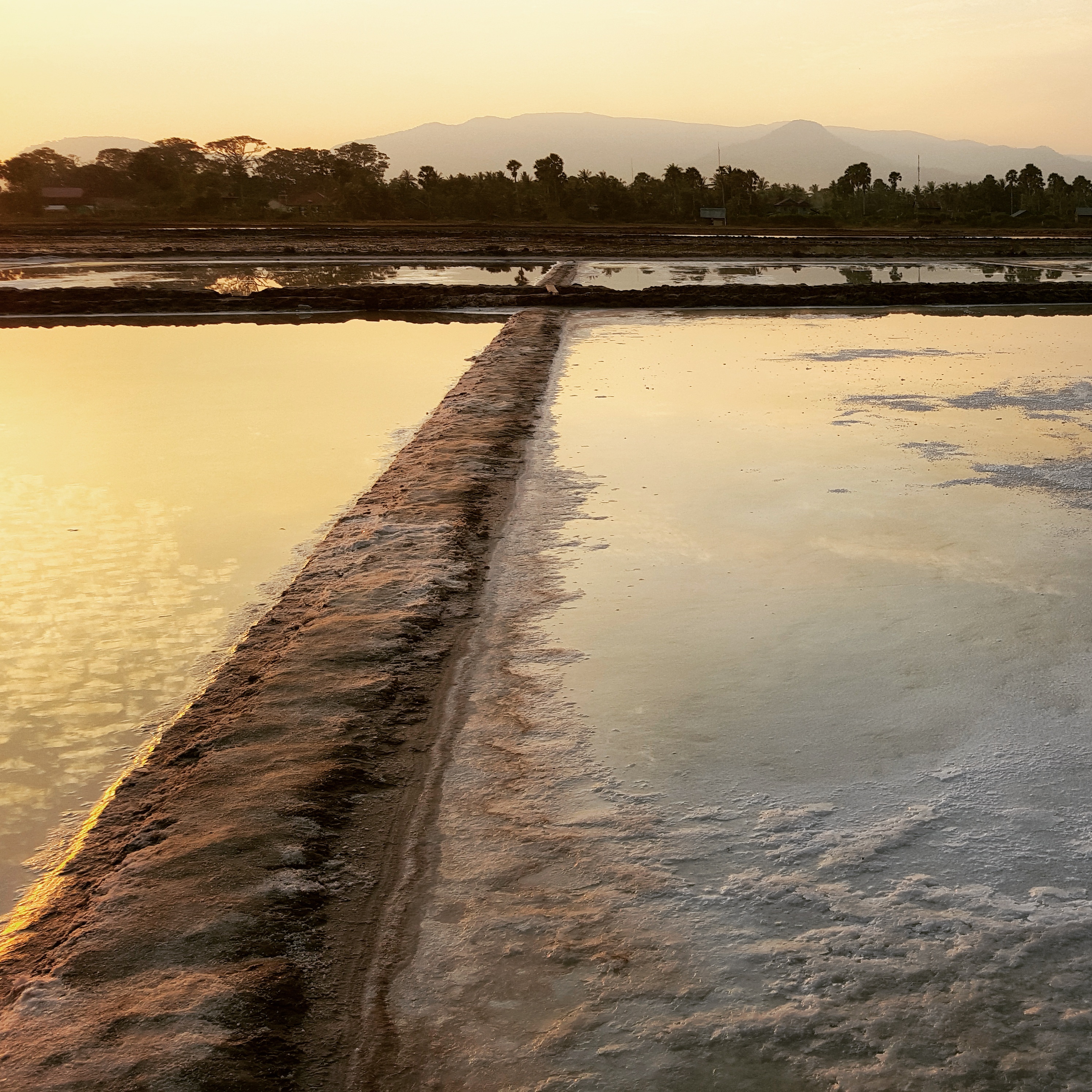 Als unsere Tuk Tuk Tour eigentlich schon fast zu Ende ging legten wir noch einen letzten Stopp an den Salzseen ganz in der Nähe von Kampot ein. Der Zeitpunkt war perfekt gewählt da gerade die Sonne unter ging und alles in ein wunderschönes Licht getaucht wurde. Unser Tuk Tuk Fahrer hat uns versucht mit seinen Englischkenntnissen zu vermitteln wie das Ganze funktioniert. Was ich mitgenommen habe ist, dass das Wasser über einen Kanal vom Meer in die Becken geleitet wird. Dann wird altes Salz zugegeben zum „animpfen“, die Sonne verdampft das Wasser und das Salz kristallisiert aus. Die Becken sind wohl recht ergiebig und es entstehen pro Becken 500kg Salz (hab ich zumindest so verstanden – kommt mir aber ganz schön viel vor!). Allerdings bekommt man für ein Kilo Salz nur wenige Riel (Landeswährung in Kambodscha). Dadurch ist daran nicht viel verdient. Ein Tütchen als Erinnerung musste natürlich mit.