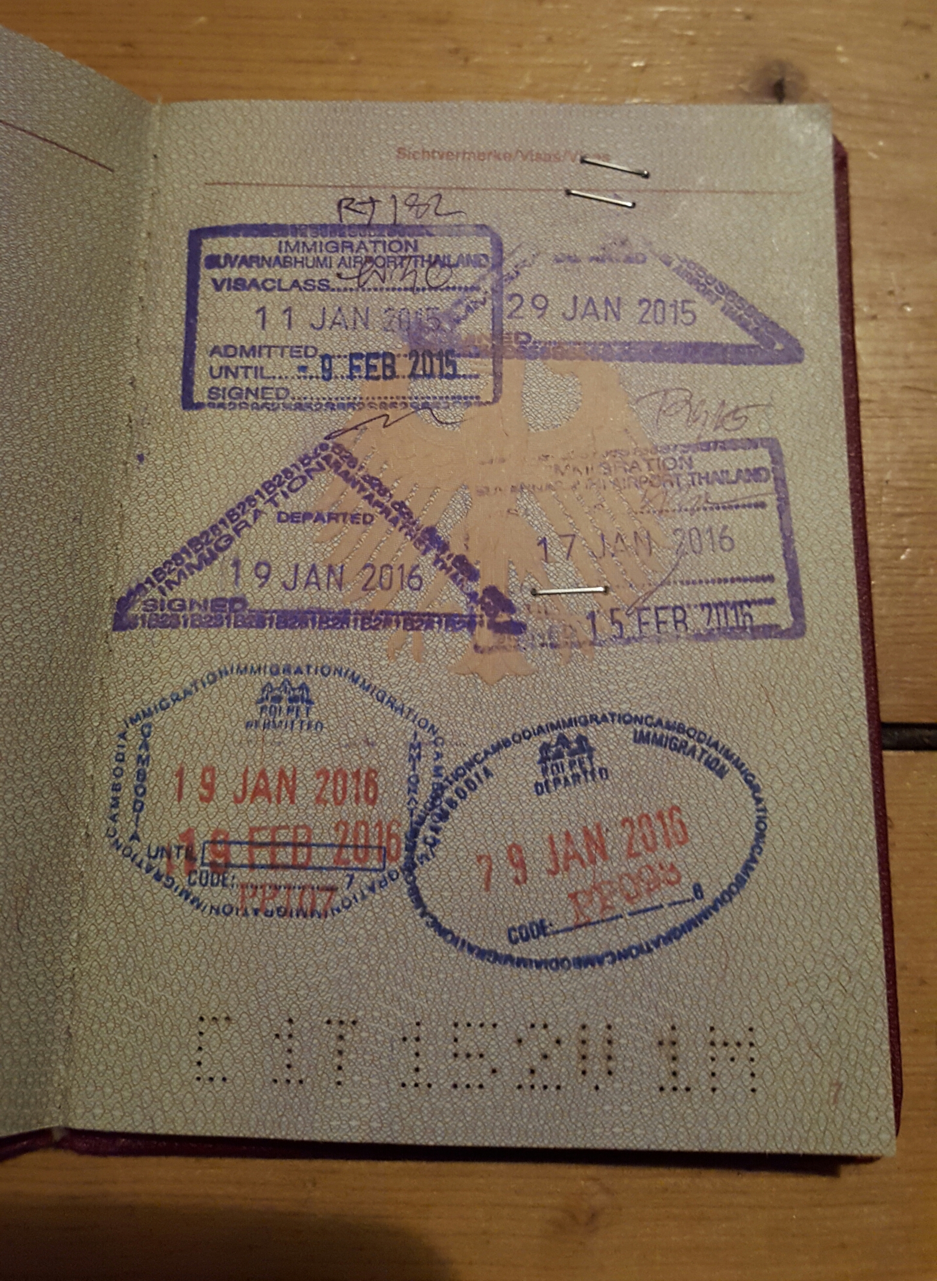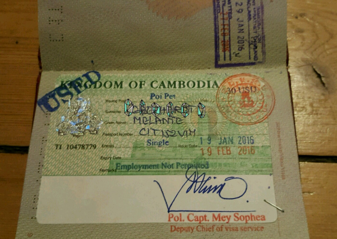 Man geht erst ein Stück die Straße hinunter Richtung Kambodscha. Nach einer Weile kommen Schilder für Personen mit ausländischem Pass und für Einheimische. Man folgt dem Schild in ein Gebäude welches über die Straße geht in den ersten Stock. Dort bekommt man einen Stempel in den Pass und somit ist man aus Thailand ausgereist. Im Anschluss geht man ein paar Meter weiter in ein Haus auf der rechten Seite. Dort stehen Personen in braunen Uniformen davor oder darin. Man füllt nun das Einreiseformular für Kambodscha aus. Dafür braucht man ein Passbild, 30 Dollar und 100 Baht für den netten Beamten als „Bearbeitungsgebühr“. Danach hat man ein hübsches Klebchen im Pass.