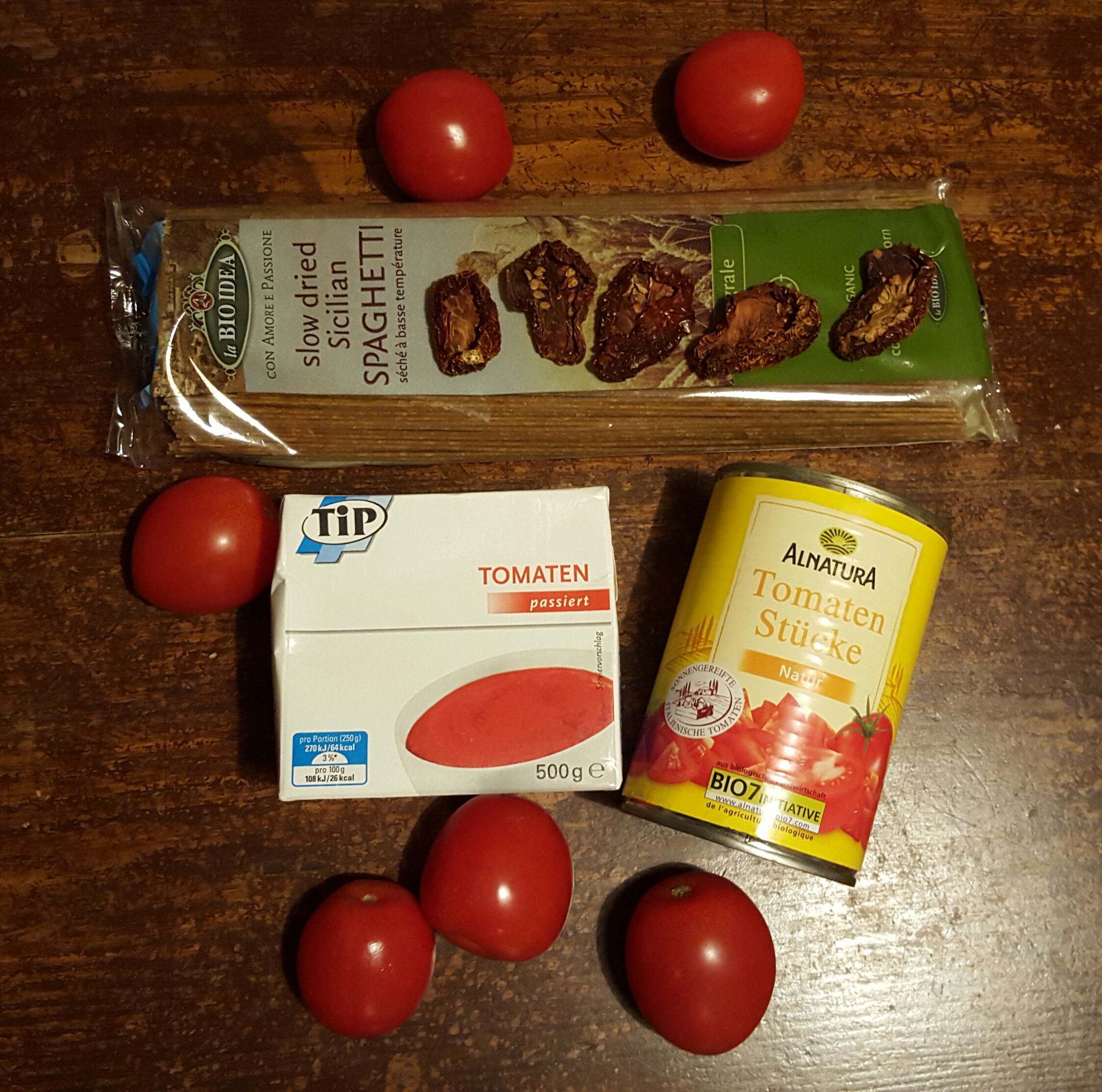 Nun Ablöschen mit den gestückelten/passierten Tomaten und mit etwas Gemüsebrühe, Salz/Pfeffer sowie den italienische Kräuter würzen. Ideal wäre es natürlich wenn man frischen Basilikum zur Hand hätte. Der macht sich ganz fantastisch dazu. Zum Schluss noch die frischen und getrockneten Tomaten zugeben.