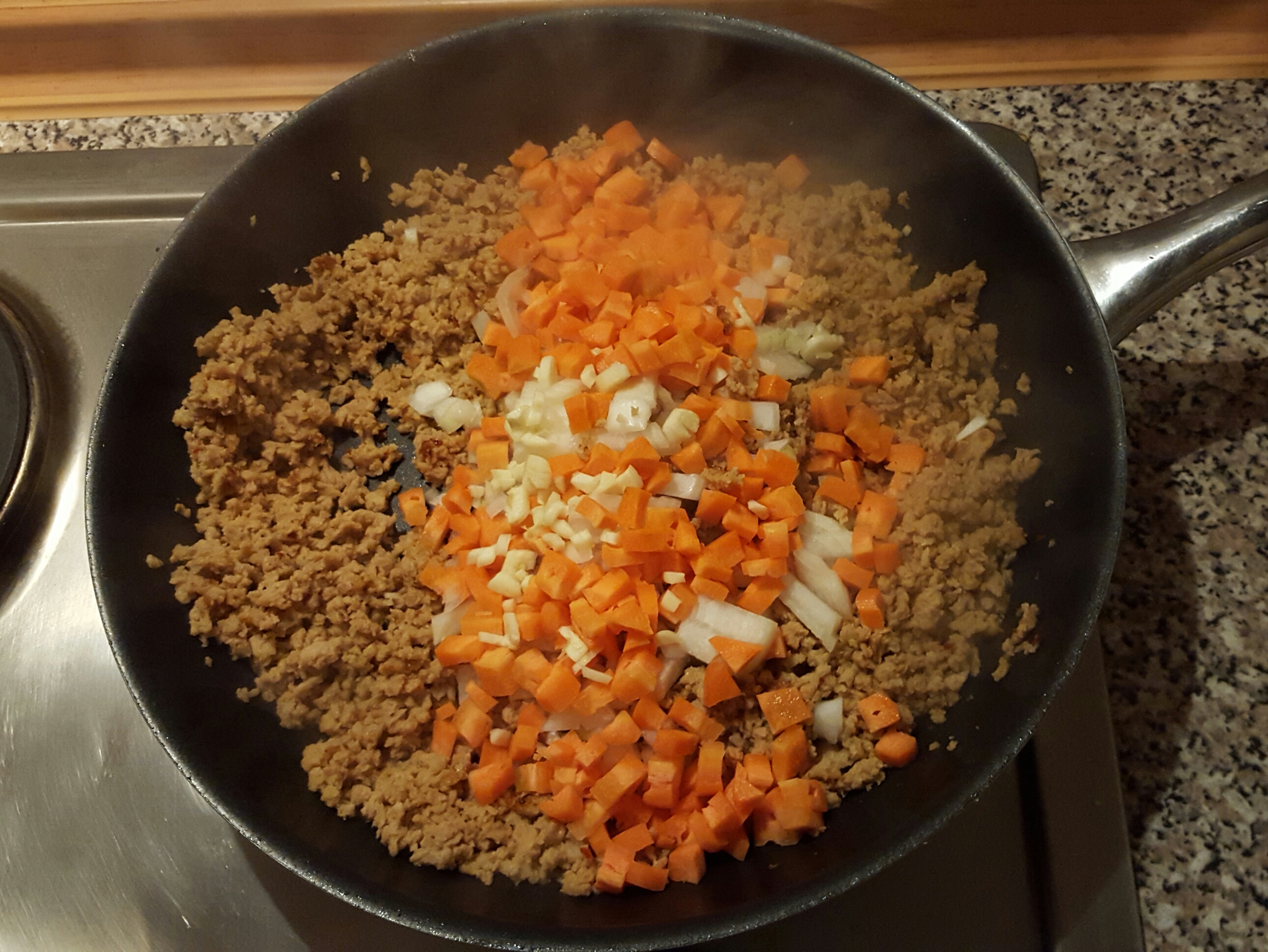 Aus heißem Wasser, Gemüsebrühe, Chiliflocken, Sojasoße, Salz und Pfeffer eine starke Brühe herstellen und die Sojaschnetzel ein paar Minuten darin ziehen und anschließend in einem Sieb abtropfen lassen. Währenddessen in einer Pfanne Öl erhitzen und die Sojaschnetzel zugeben. Das Ganze scharf anbraten. Dann Zwiebel und Möhre hinein geben und etwas mitbraten. Zum Schluss noch den Knoblauch dazu geben und auch kurz mitbraten lassen.