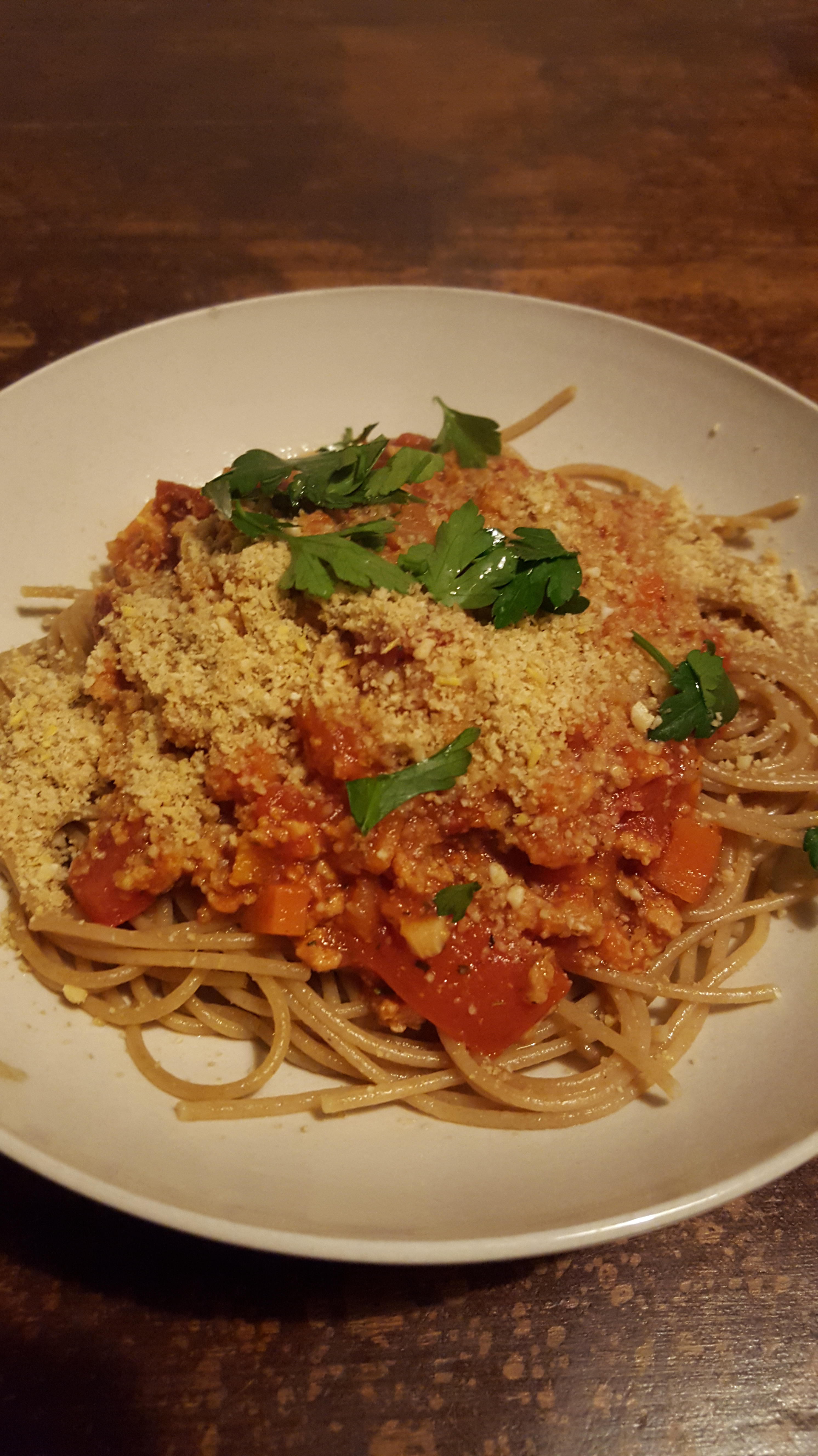 Dazu gibt es Vollkorn-Spaghetti und selbstgemachten Parmesan. Das Rezept für den Parmesan habe ich bei http://weloveitvegan.com/ gefunden und musste es natürlich gleich ausprobieren. Er wird hergestellt aus Mandelsplitter, Pinienkernen, Hefeflocken und Paniermehl. Geschmackstest eindeutig bestanden! Zum Rezept geht’s hier.