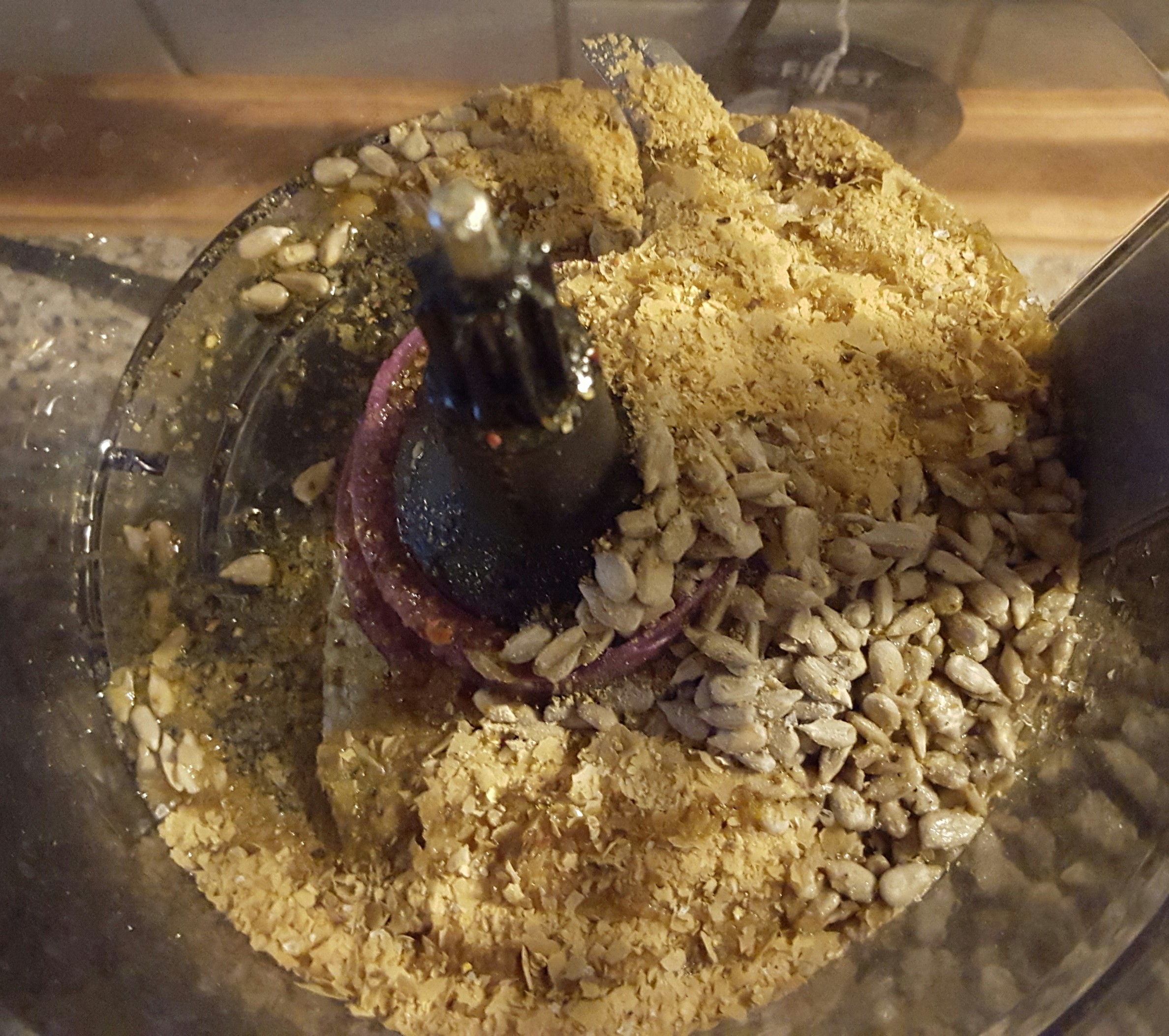 Zwiebel und Knoblauch in einer Pfanne anschwitzen und in den Mixer geben. Die restlichen Zutaten (bis auf das Wasser) dazugeben und gut vermixen lassen. Ich prüfen zwischendrin die Konsistenz und gebe nach Bedarf noch etwas Wasser dazu. Selbstverständlich kann man auch dafür Olivenöl benutzen. Da ich es aber nicht so fettig mag nehme ich immer nur einen Schuss Olivenöl und verdünne dann mit Wasser. Aber das kann ja jeder so halten wie er es am liebsten mag. Noch mit Salz und Pfeffer abschmecken – fertig!