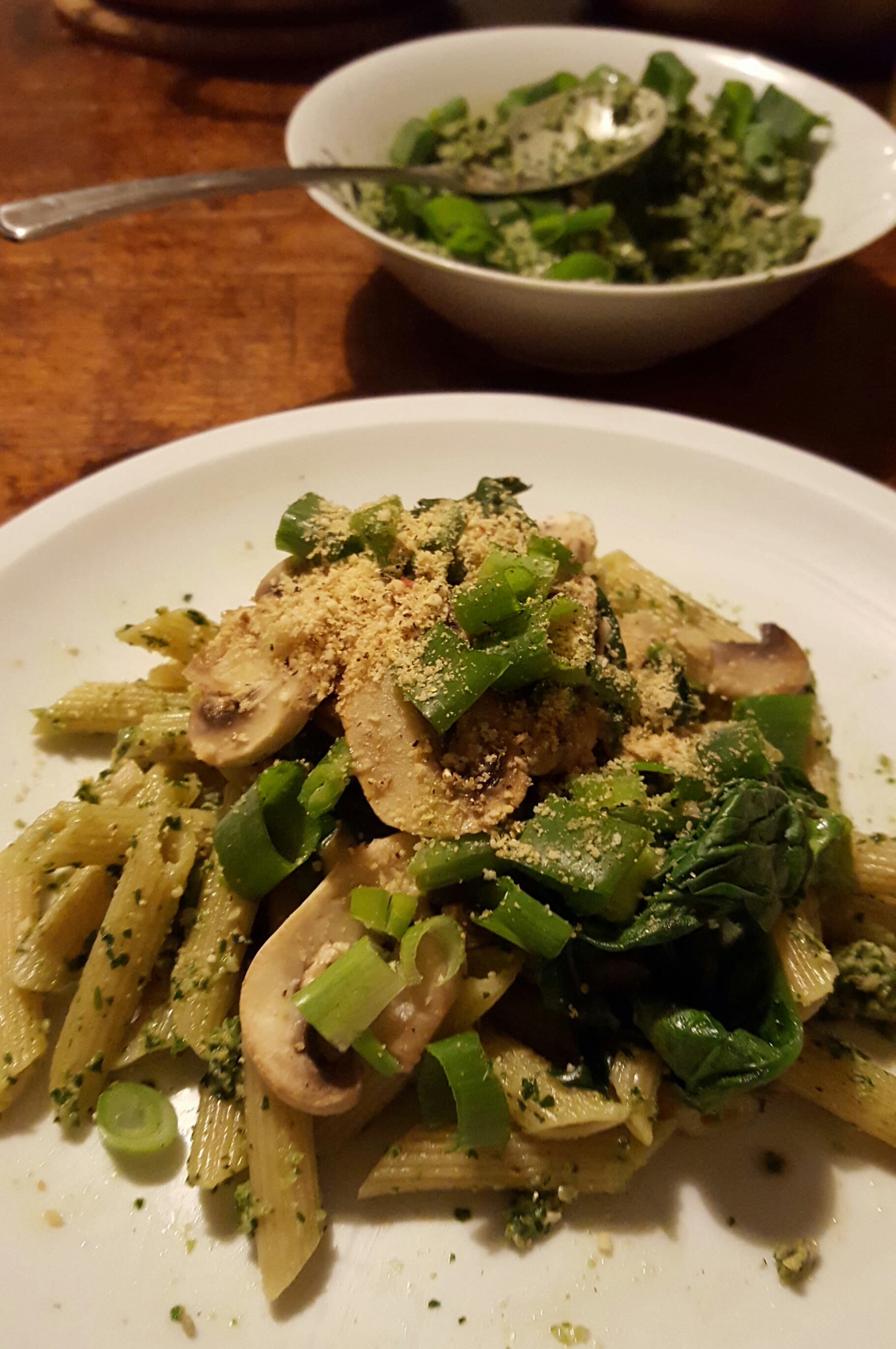 Bei mir gab’s Vollkorn-Penne und ein paar Champignons mit Spinat und Frühlingszwiebeln dazu.Lecker! Die Reste gibt es gleich und ich freue mich schon riesig drauf!