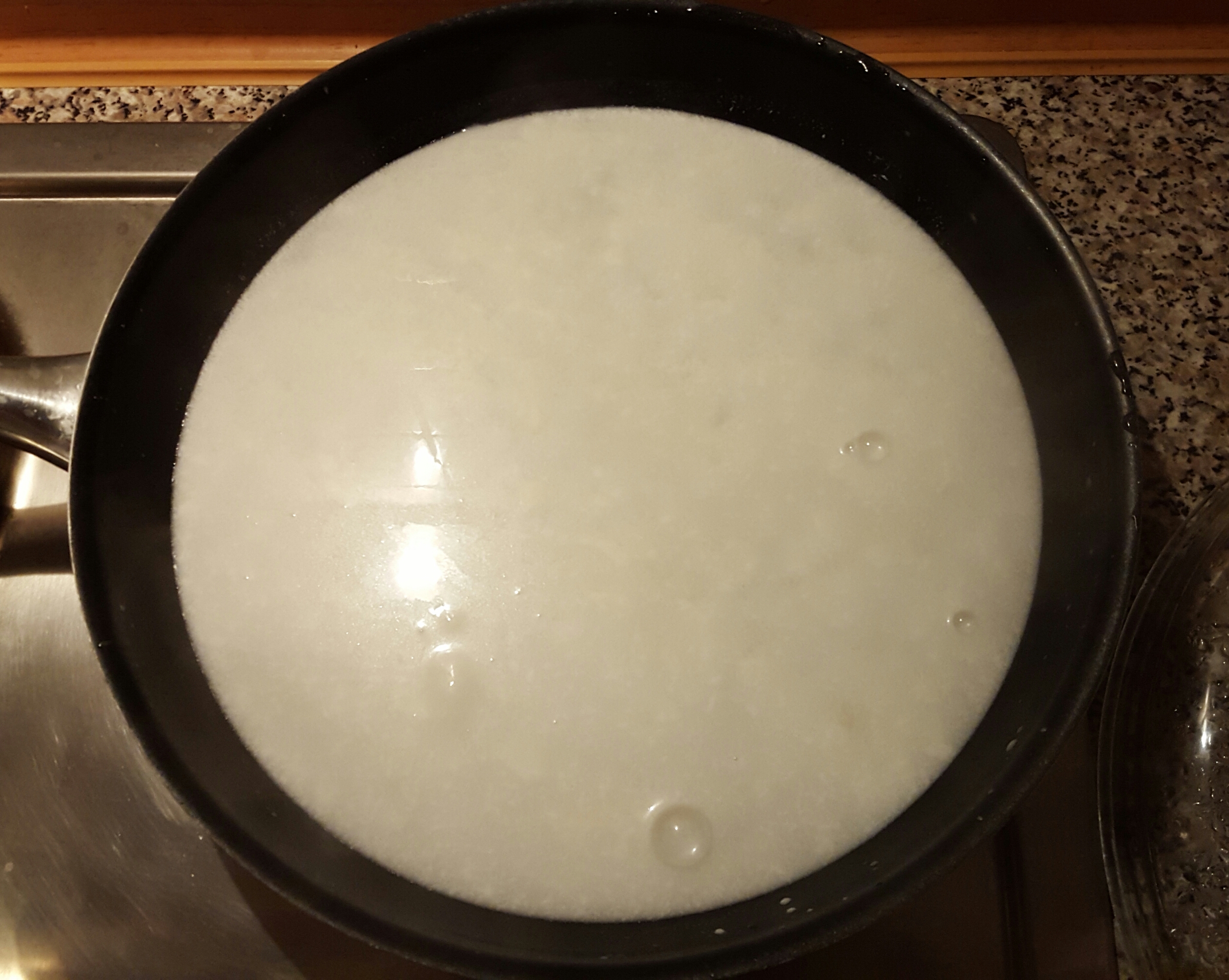 - In einer Pfanne 480 ml Wasser erhitzen. Wenn es kocht 1 Dose Kokosmilch zugeben und kurz köcheln lassen