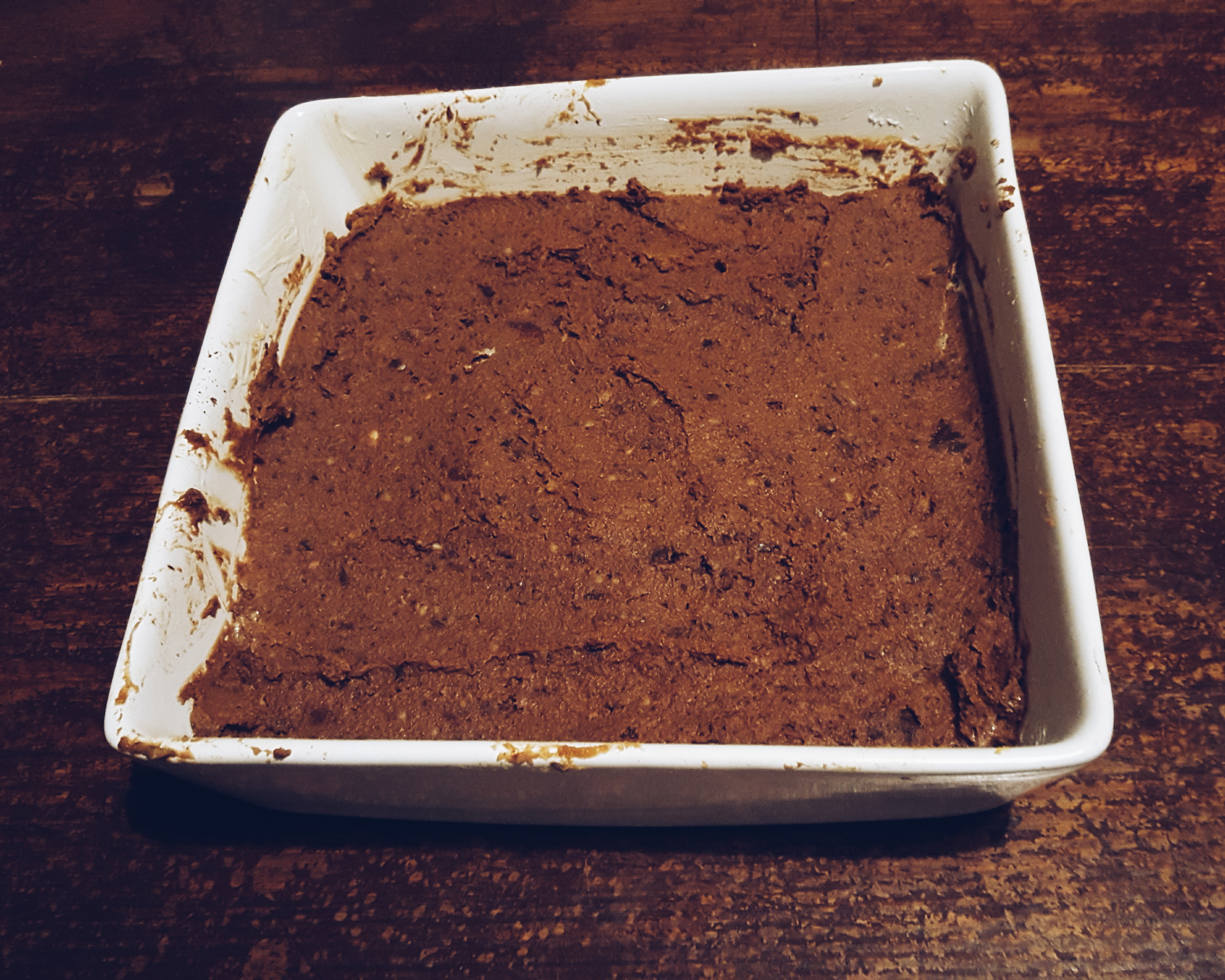 Nun den Süßkartoffel-Dattel-Brei zu den trockenen Zutaten geben und gut vermischen. Dann das Ganze in eine gefettete Form geben und für 20 Minuten bei 180°C backen. Nach dem Auskühlen kann wer möchte die Brownies noch mit Rohkakao und Zimt bestäuben.