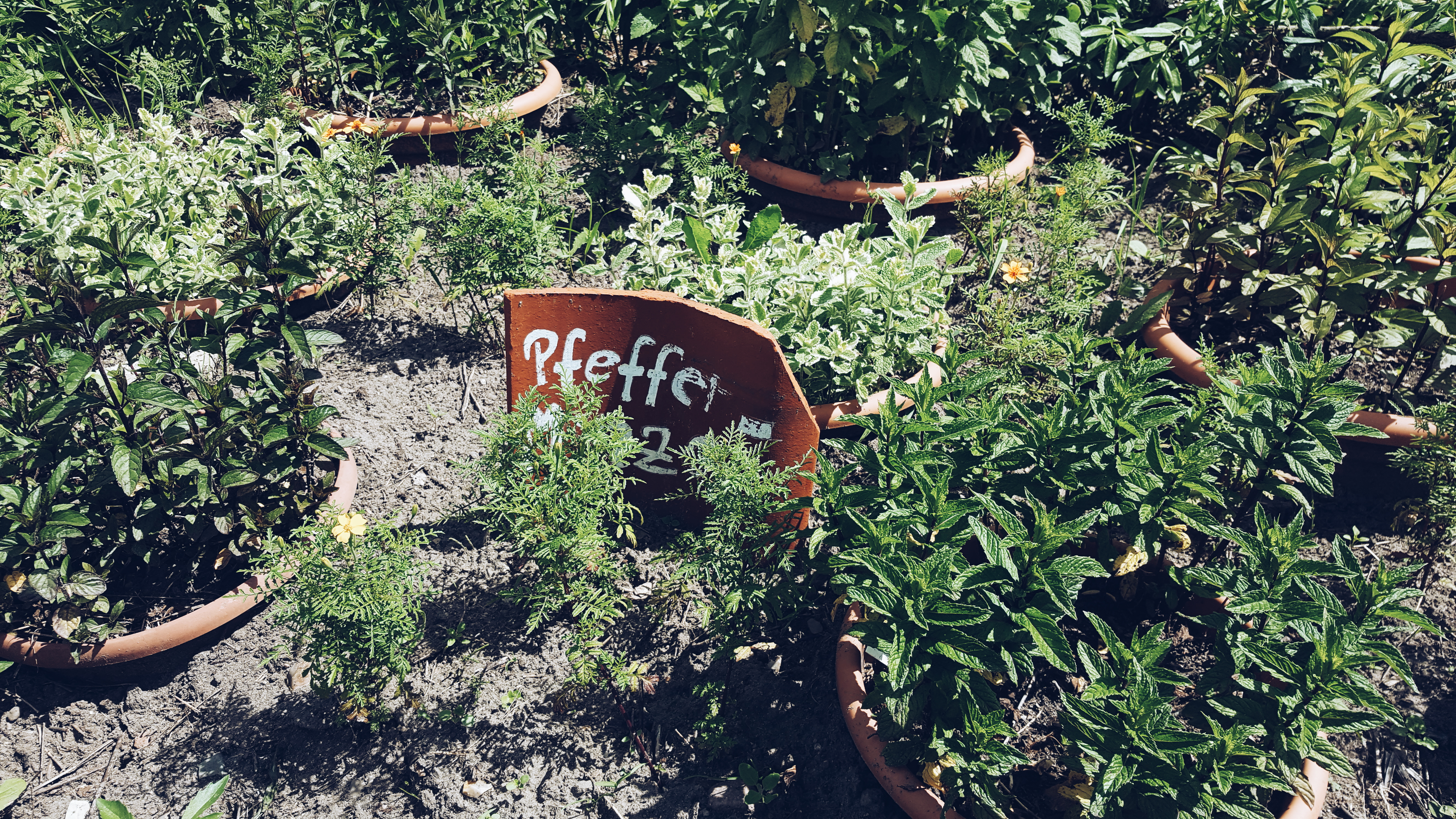 Zum Sammeln der Wildkräuter ging man über das schöne Gelände des Demeter-Hofes und bekam dabei jede Menge über dieses und jenes Kraut erzählt. Wir bekamen gezeigt wo bestimmte Kräuter gerne wachsen und wie wir Verwechslungen vorbeugen können. Besonder toll fand ich es im Kräutergarten des Hofes. Dort waren tolle, wilde Beete mit einer riesigen Sammlung der unterschiedlichsten Kräuter. Es gab Beete voll mit verschiedener Minze, Thymian, wunderschön blühender Schnittlauch und natürlich jeder Menge Kraut das ich nicht kannte. Eins davon war zum Beispiel Schnittknoblauch. Sieht ein bisschen aus wie etwas zu dicker Schnittlauch und schmeckt ganz wunderbar nach Knoblauch. Davon habe ich gleich ein Töpfchen im Hofladen erworben. Ich hoffe sehr er fühlt sich wohl auf meinem Balkon und groß und stark wird!