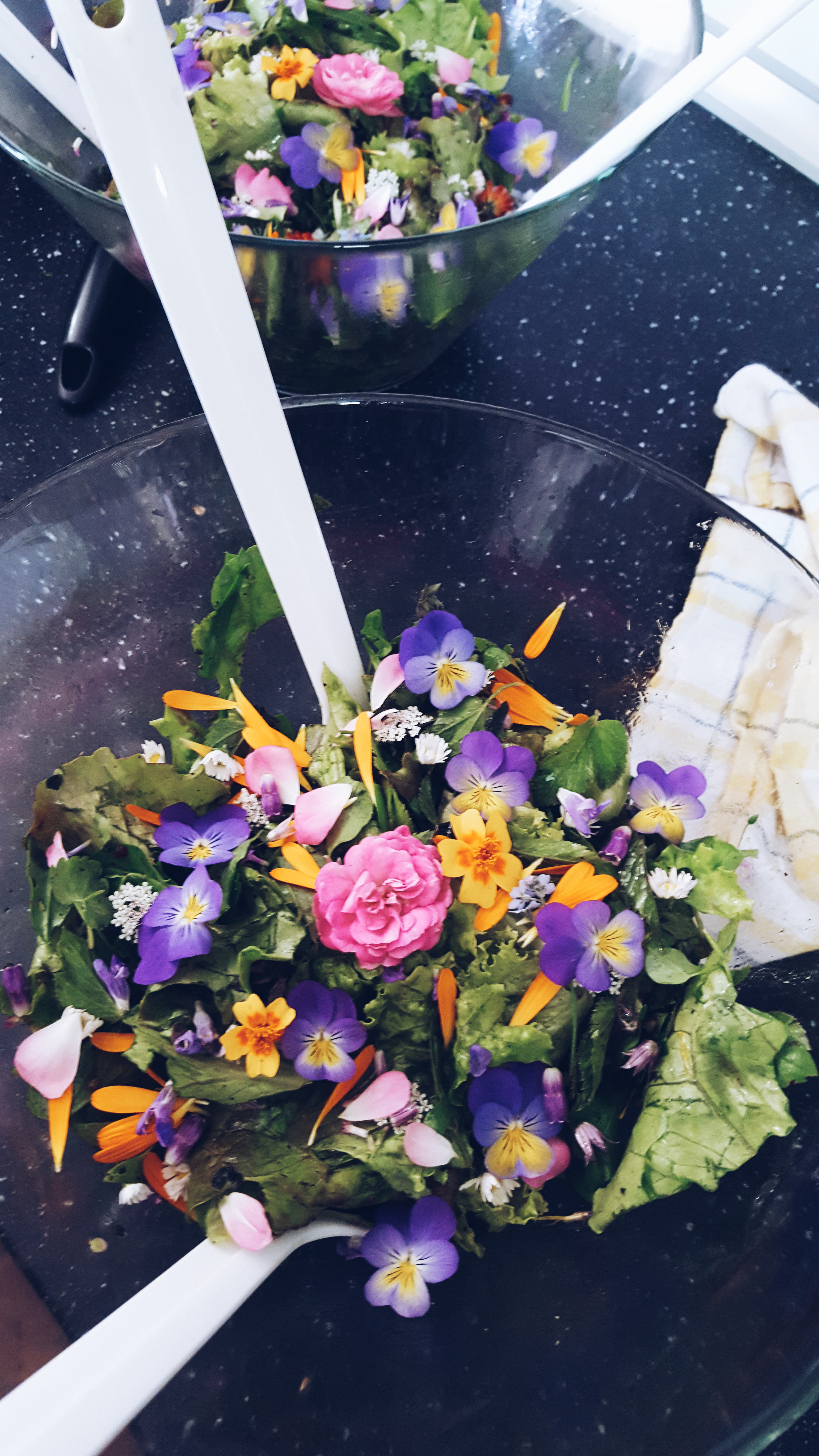 Gesammelt haben wir vor allem Giersch, Löwenzahn, Brennnessel, Gundermann, Vogelmiere, Schafsgarbe, Spitz- und Breitwegerich, Sauerampfer und Gänseblümchen. Dazu noch die ein oder andere essbare Blüte sowie meine neues Lieblingskraut den Schnittknoblauch.